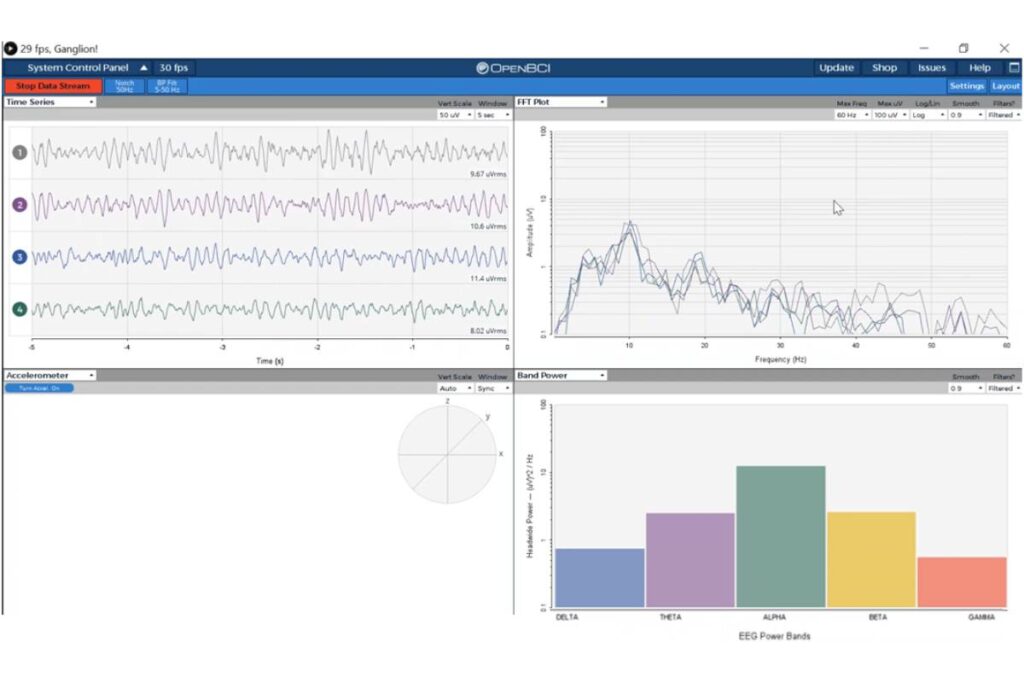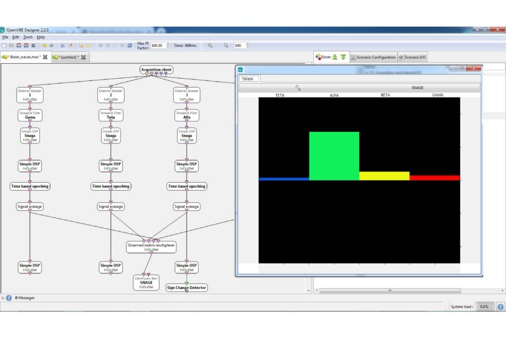 Technology : gold cup electrodes that register brain activities (put on the head), these brain activities are augmented by OpenBCI Ganglion hardware which is sending the signal through Bluetooth protocol to the computer. On the computer, activation and visualization of the EEG signal take place, as well as online signal processing in OpenVibe software. Notch filtration and frequency band extraction (alpha (8-13 Hz), beta (14-30 Hz) and theta waves (4-7 Hz)) is performed in real time.